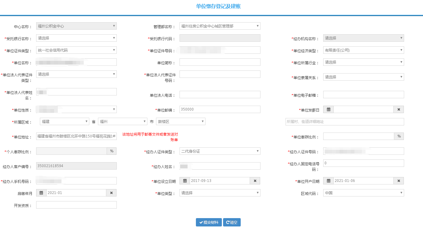 2、在“单位缴存登记及建账”完善单位信息,然后点击“提交材料”。如下图所示: