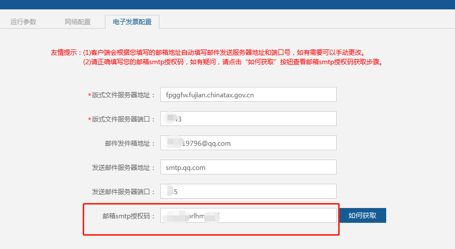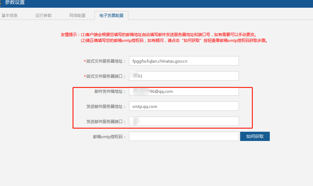 首先,进入开票软件,选择“参数设置”-“电子发票参数设置”,将“邮件发件箱地址”处填入一个邮箱号,填完后“发送邮件服务器地址”及“发送邮件服务器端口”会自动跳出数据。如下图所示: