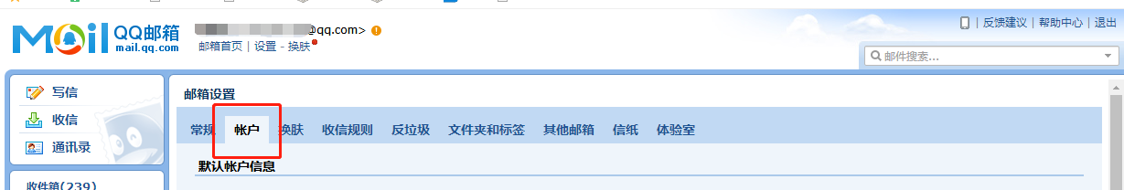 其次,获取邮箱smtp授权码,登录前面填写的QQ邮箱,点击左上角的“设置”-“账户”。如下图所示: