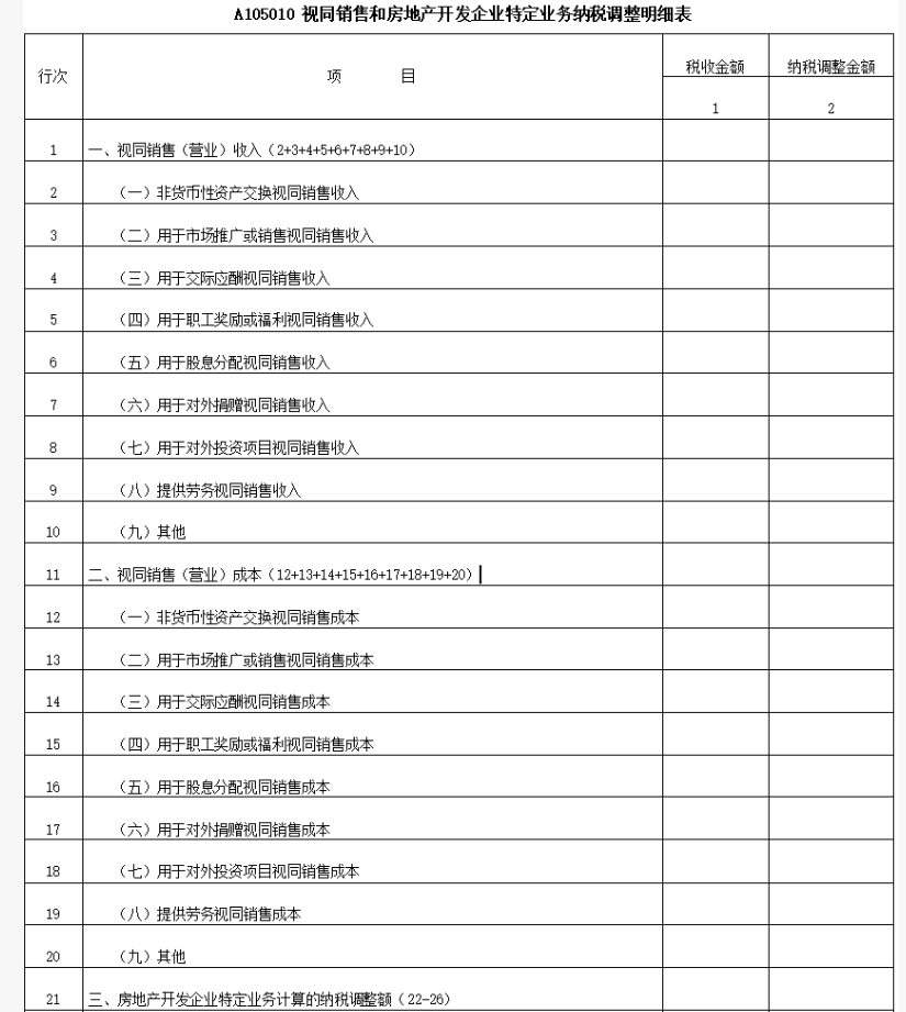 税法上,视同销售需要填写《A105010 视同销售和房地产开发企业特定业务纳税调整明细表》,如下图所示:
