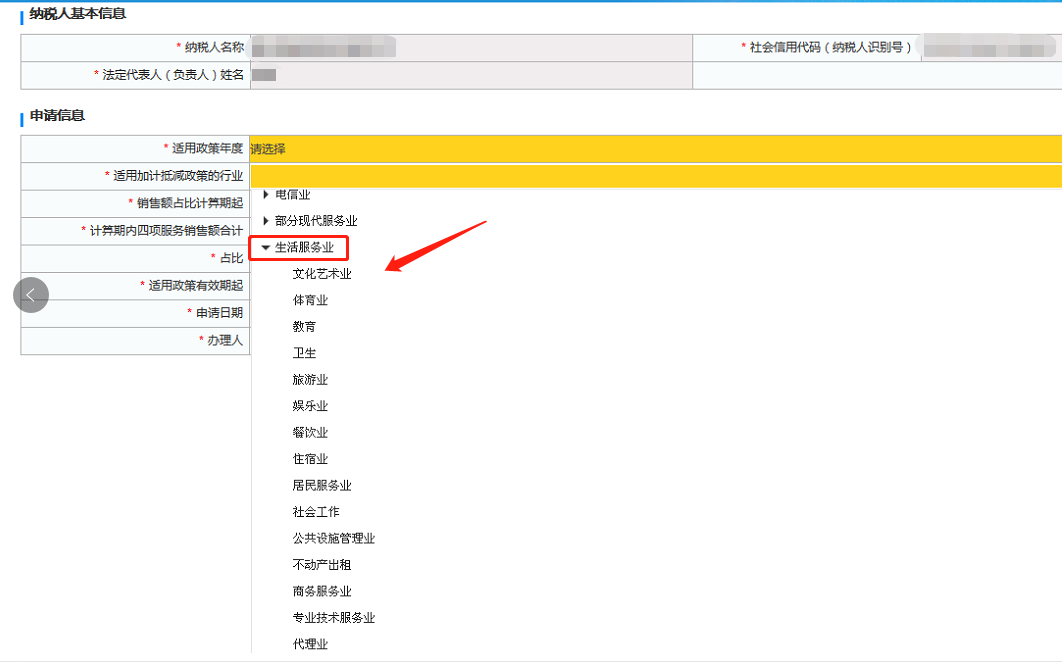 A公司的所属行业并不归属生活服务业,所以不能享受此政策,只能按现代服务业10%的进项税额加计抵减,在填报《加计抵减政策申明》时,生活服务业底下还有其他行业,如不动产出租、商务服务业、专业技术服务、代理业等并不适用15%抵减政策,如下图所示: