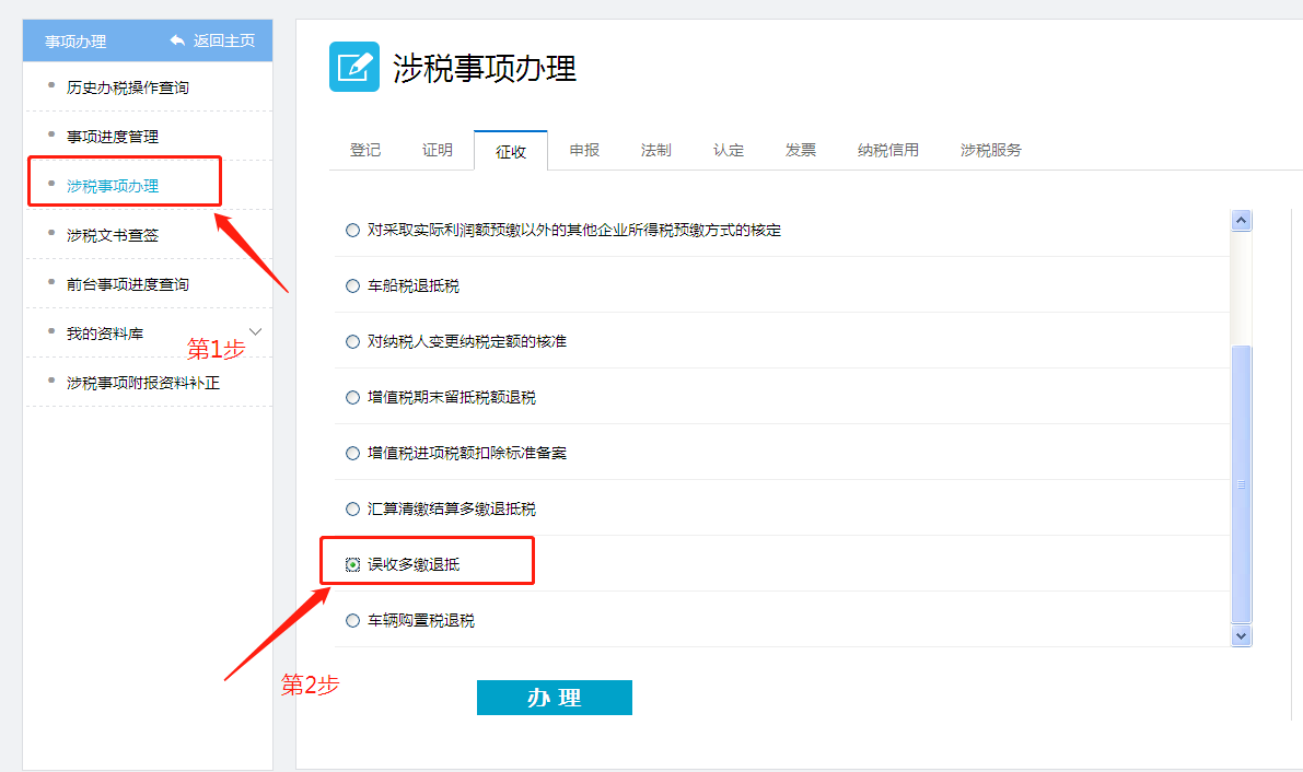 第二步:选择“涉税事项办理”—“征收”—“误收多缴退抵”,如下图图2所示: