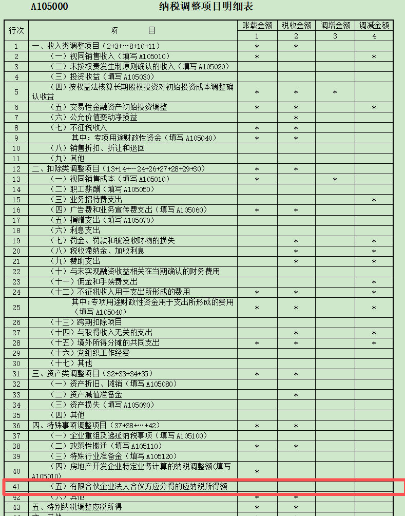 第41行“(五)有限合伙企业法人合伙方分得的应纳税所得额”:第1列“账载金额”填报有限合伙企业法人合伙方本年会计核算上确认的对有限合伙企业的投资所得;第2列“税收金额”填报纳税人按照“先分后税”原则和《财政部 国家税务总局关于合伙企业合伙人所得税问题的通知》(财税〔2008〕159号)文件第四条规定计算的从合伙企业分得的法人合伙方应纳税所得额;若第1列≤第2列,将第2-1列余额填入第3列“调增金额”,若第1列>第2列,将第2-1列余额的绝对值填入第4列“调减金额”。