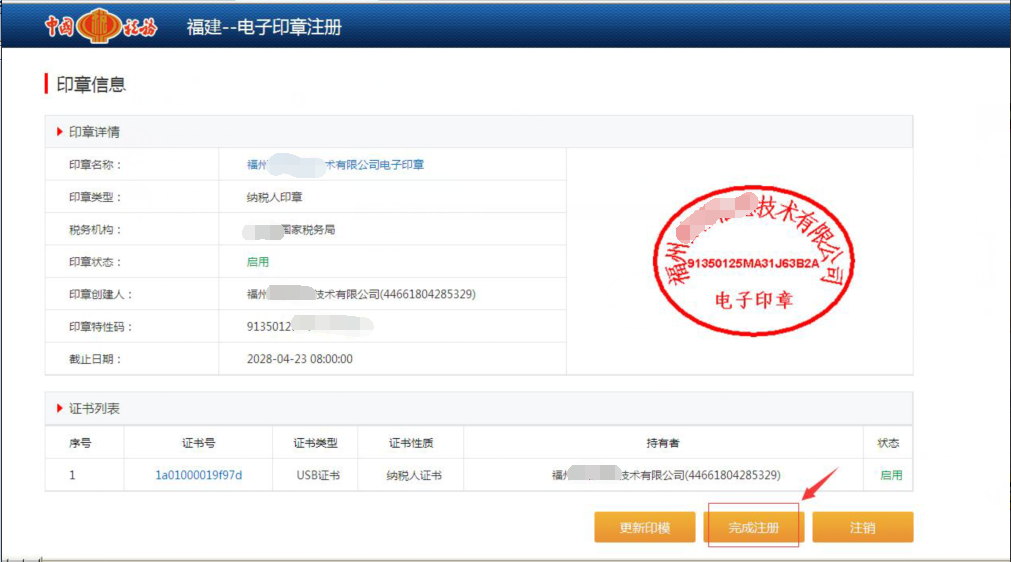五、点击生成电子印章,就完成电子印章注册,如下图: