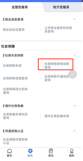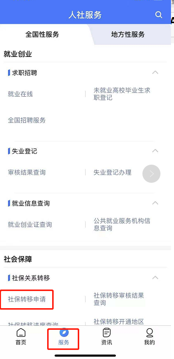 二、注册登入后,在“服务”模块中,选择“社保转移申请”如下图所示: