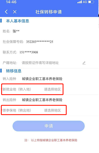 三、填写社保转移申请,选择“新转入地”和“原参保地”提交申请即可。如下图所示: